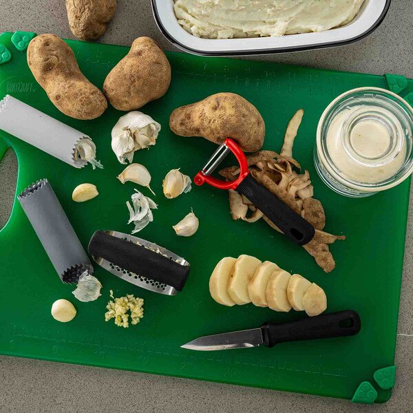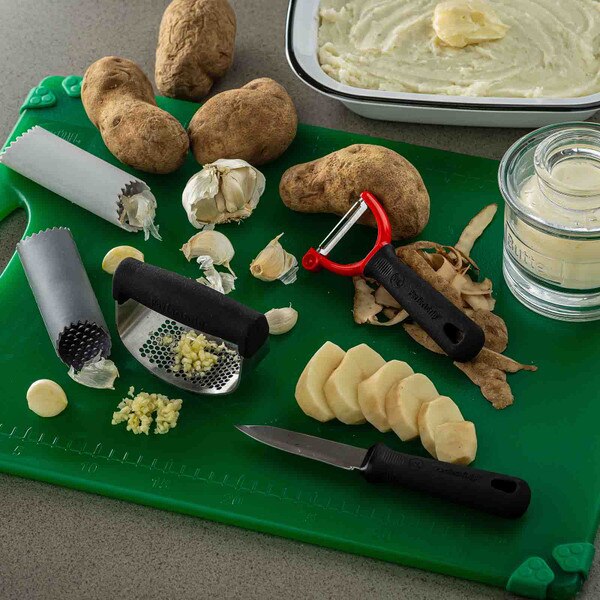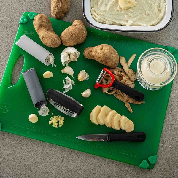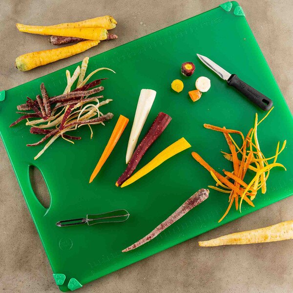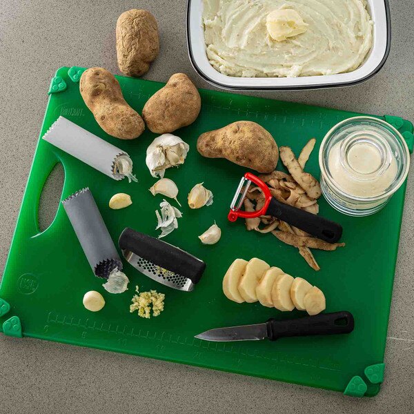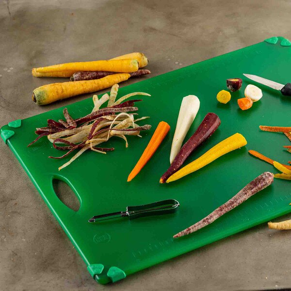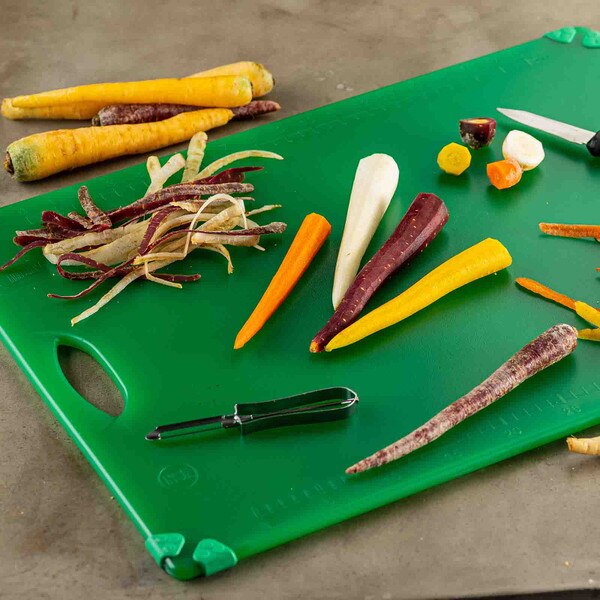 Upgrade your prep stations with our Grippy™ Cutting Boards — designed for safety, precision, and durability. Each board is color-coded to support HACCP compliance, reducing the risk of cross-contamination and ensuring best food safety practices. The integrated embossed measurements help operators achieve accurate cuts and portion control, while the non-slip corner grips keep the board securely in place during use. Built for the demands of commercial kitchens, these boards are dishwasher safe, heat resistant, chemical resistant, and warp resistant. An integrated handle adds convenience, making them easy to carry, store, and clean. Reliable, sanitary, and built to last -- Grippy™ Cutting Boards are the professional’s choice.