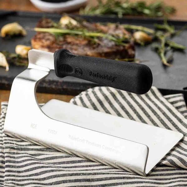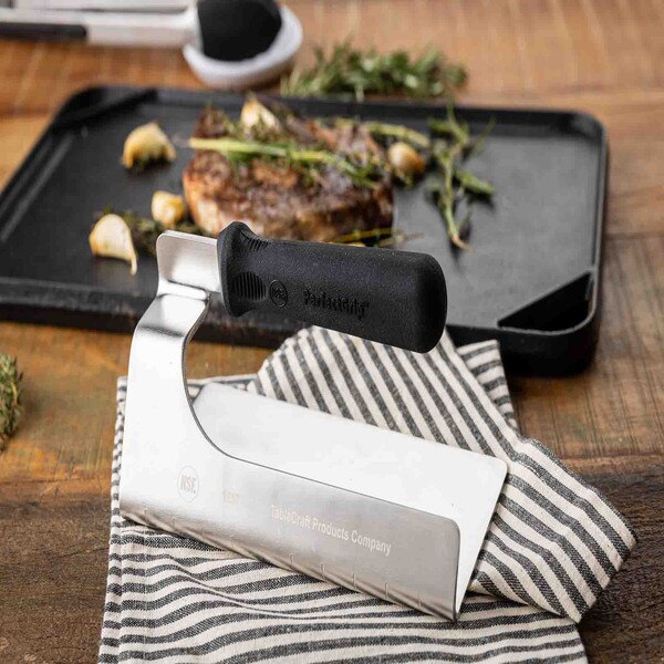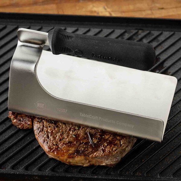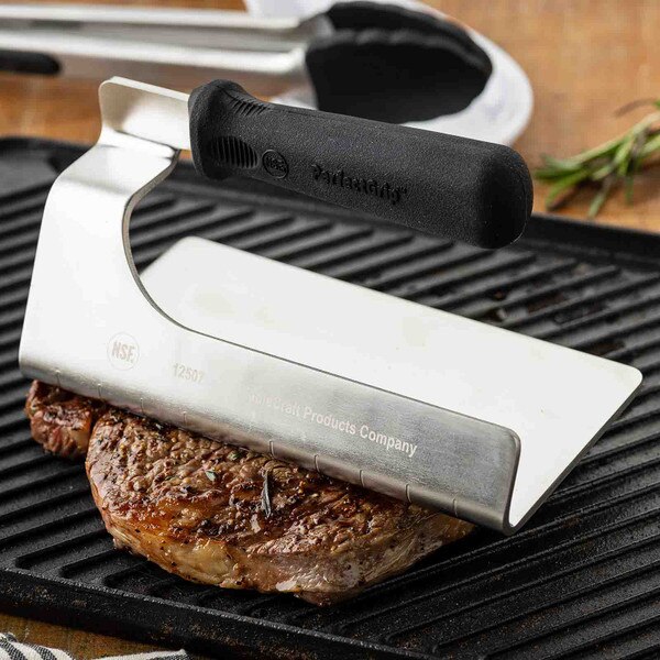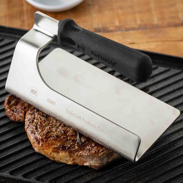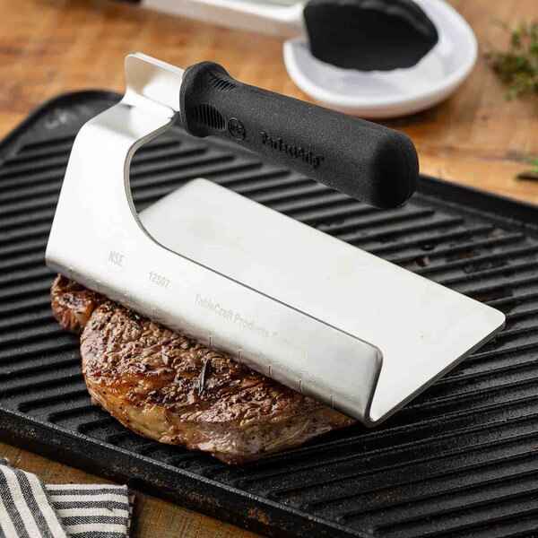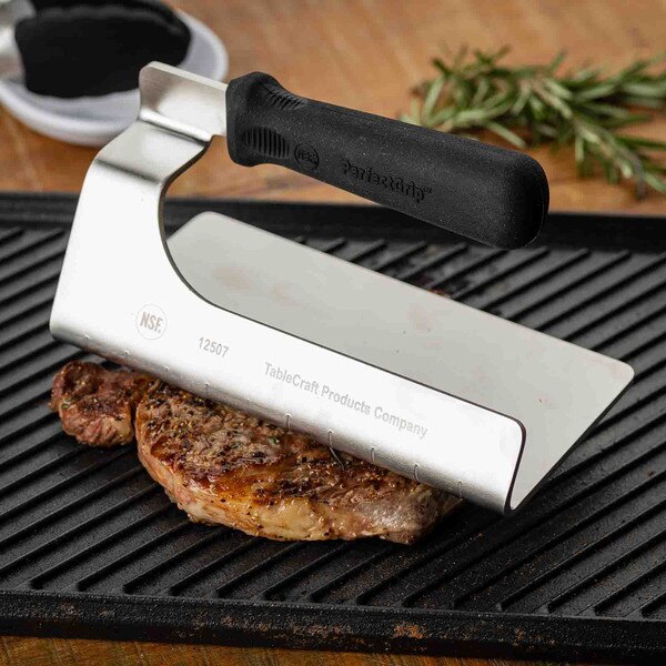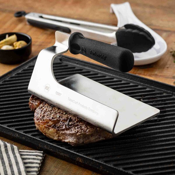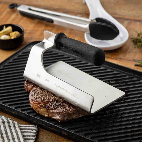 Achieve a consistent sear and professional results every time with our PerfectGrip® stainless steel steak weight. NSF-certified for safety and quality, this essential tool delivers even heat distribution to lock in flavor and speed up cooking. The ergonomic silicone handle provides a comfortable, secure grip -- even in high-heat, high-volume kitchens. Perfect for steaks, burgers, paninis, and grilled sandwiches, this steak weight is a reliable solution for restaurants, catering operations, and even home cooks looking to boost efficiency and ensure delicious results with every press.