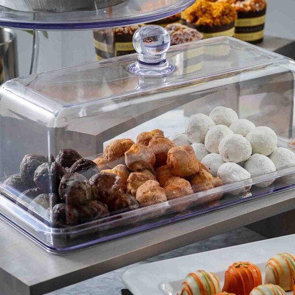Part of our new upscale bakery display collection, this unique, rectangular Cake Dome features a knob handle for secure lifting, and a touch of class. Our dome is made from durable, clear SAN plastic so your appetizers, desserts, bakery, or sandwich items are beautifully displayed. Matching rectangular cake plate sold separately.