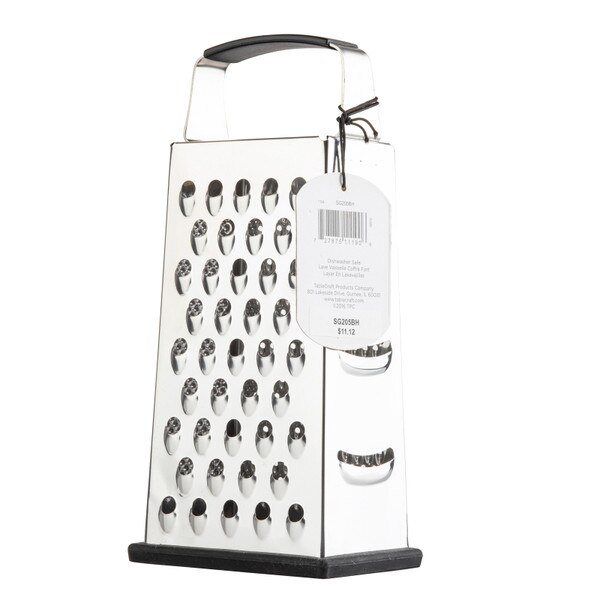 Tackle a variety of prep tasks with our compact 4-sided tapered grater, designed for versatility and efficiency in professional kitchens. Each side offers a different function -- fine grating, coarse grating, zesting, and slicing -- making it the perfect all-in-one tool for cheese, vegetables, citrus, and more. A sturdy top handle provides a secure grip for stability during use, while the durable stainless steel construction withstands heavy-duty, daily foodservice demands and the rubber bottom keeps it in place. Compact and efficient, this grater is an essential tool for restaurants, catering, and high-volume kitchens.